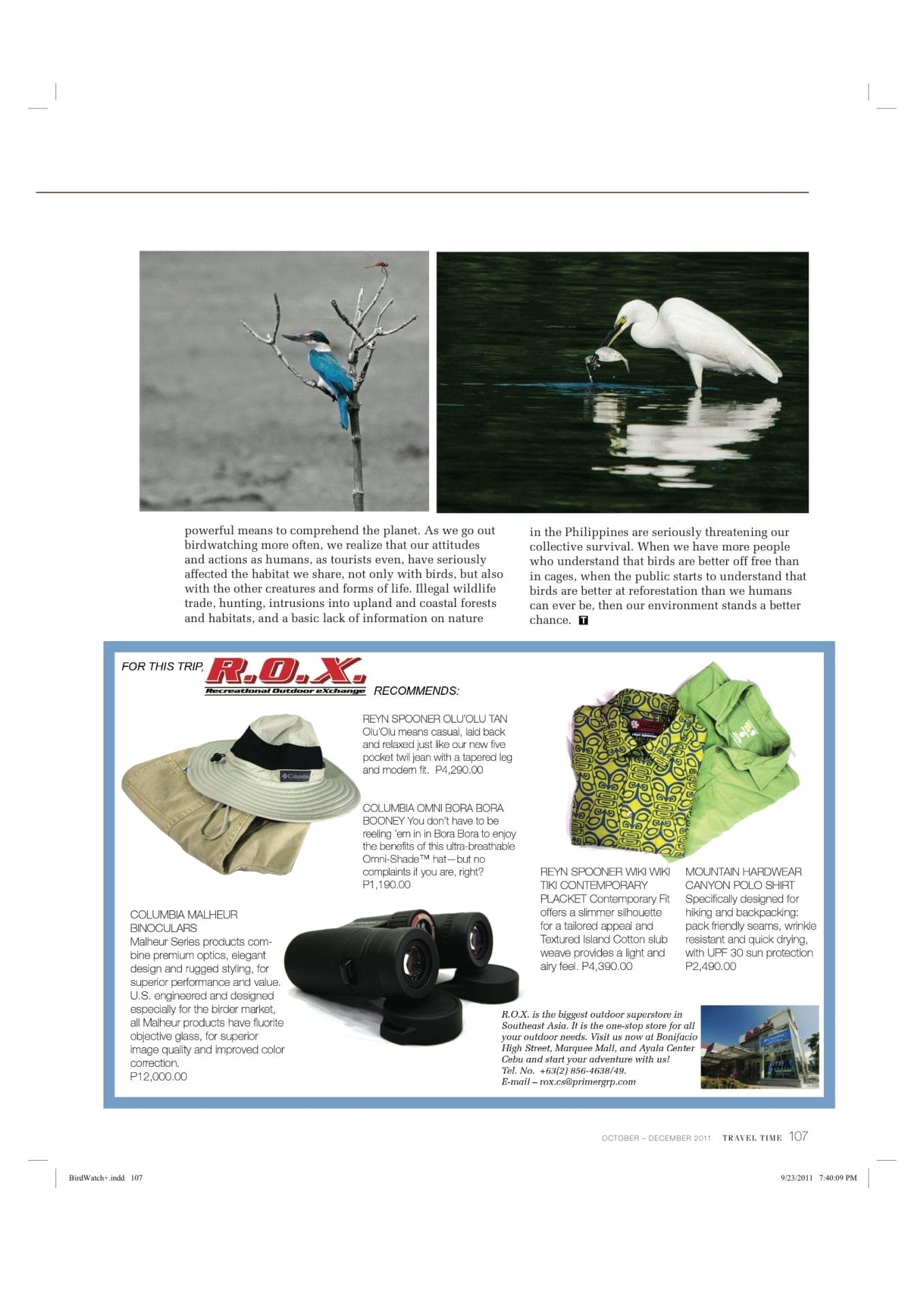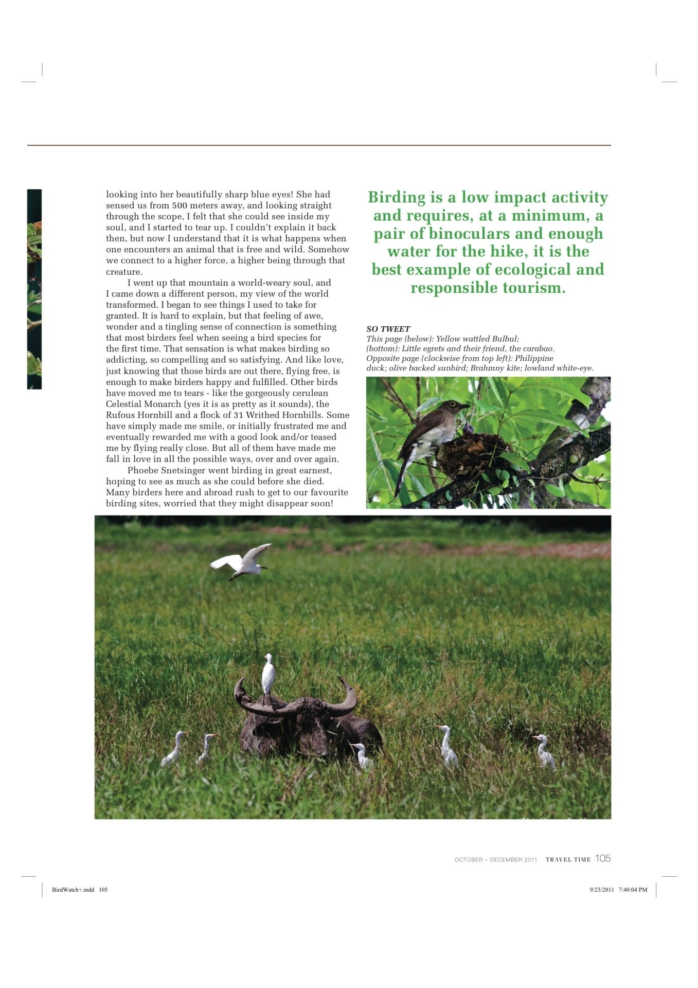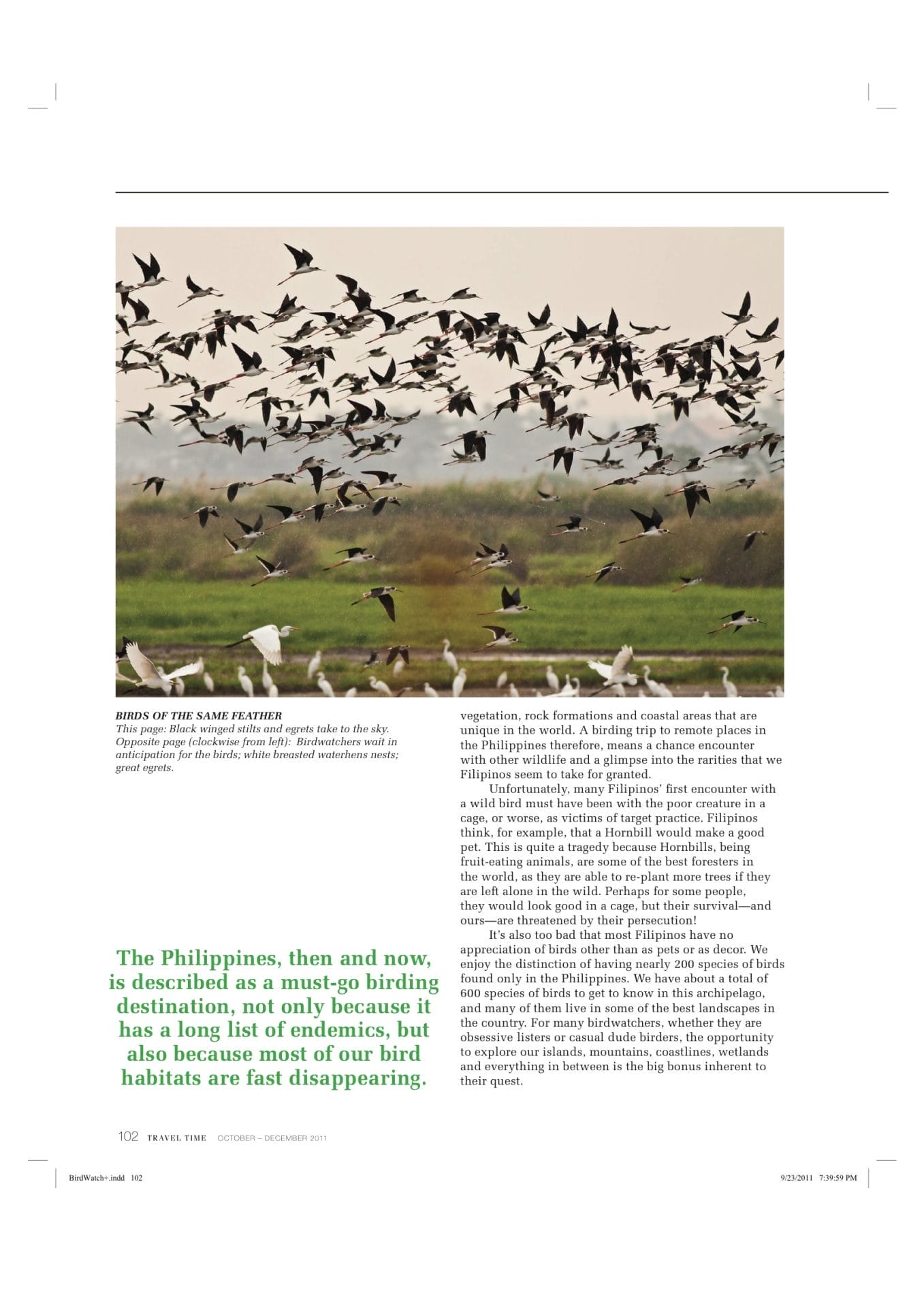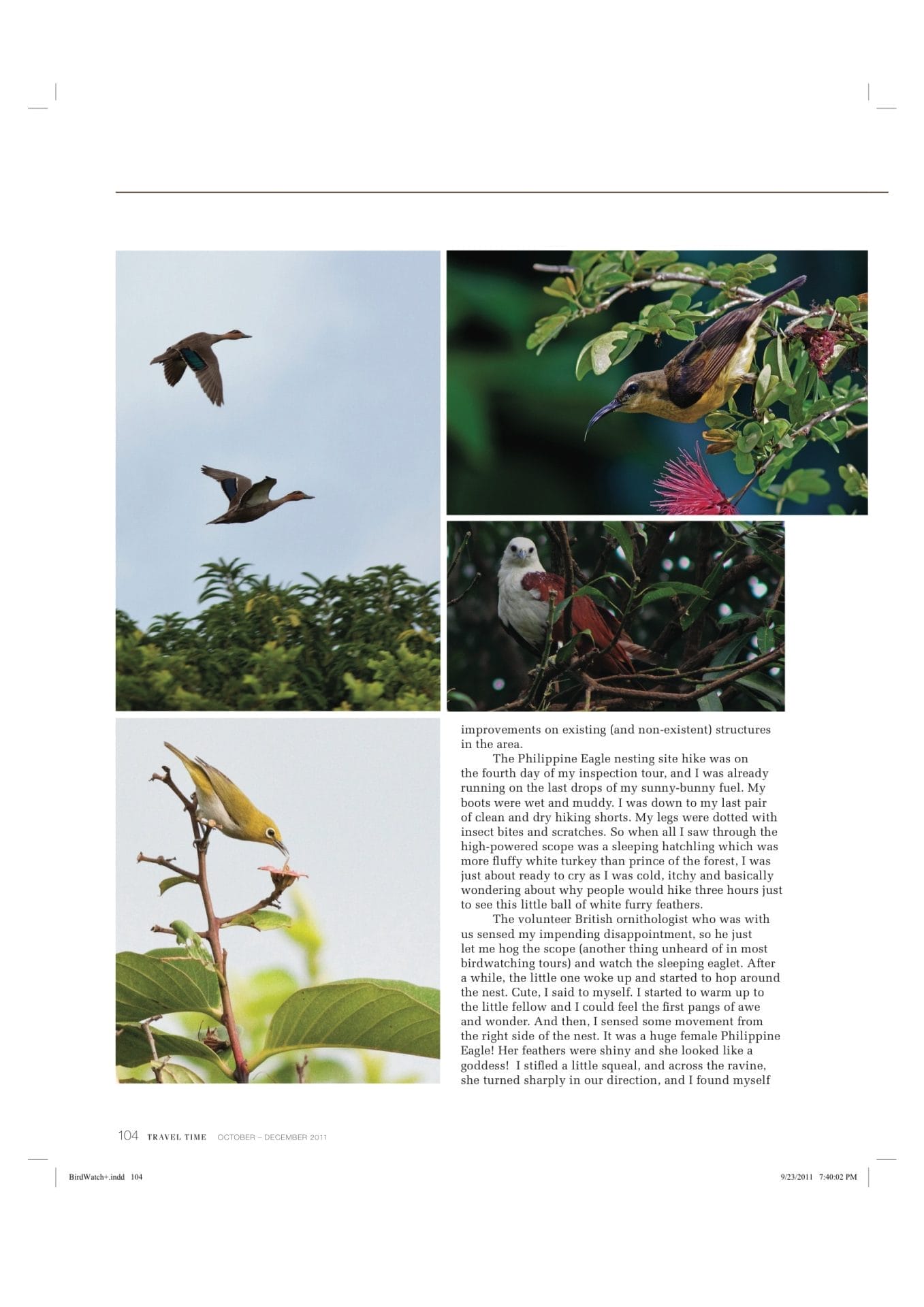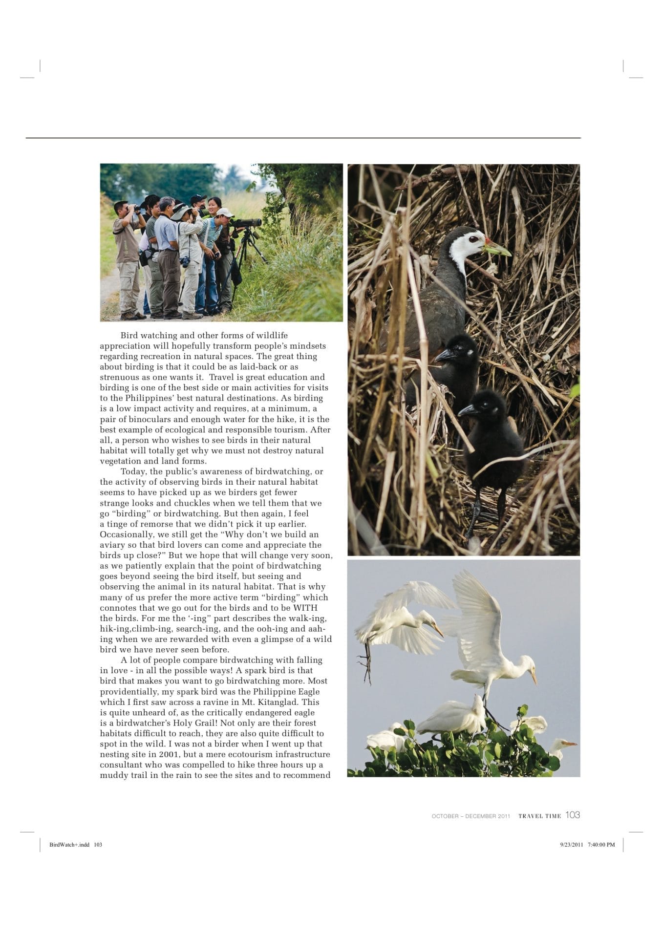 Here is WBCP President Anna Gonzales’ article that is featured in the October-December 2011 of Susan Calo Medina’s Travel Time magazine. The article is about birdwatching, how she got hooked, and how it changed the way she sees things. The bird photographs are by WBCP Vice President Alain Pascua.