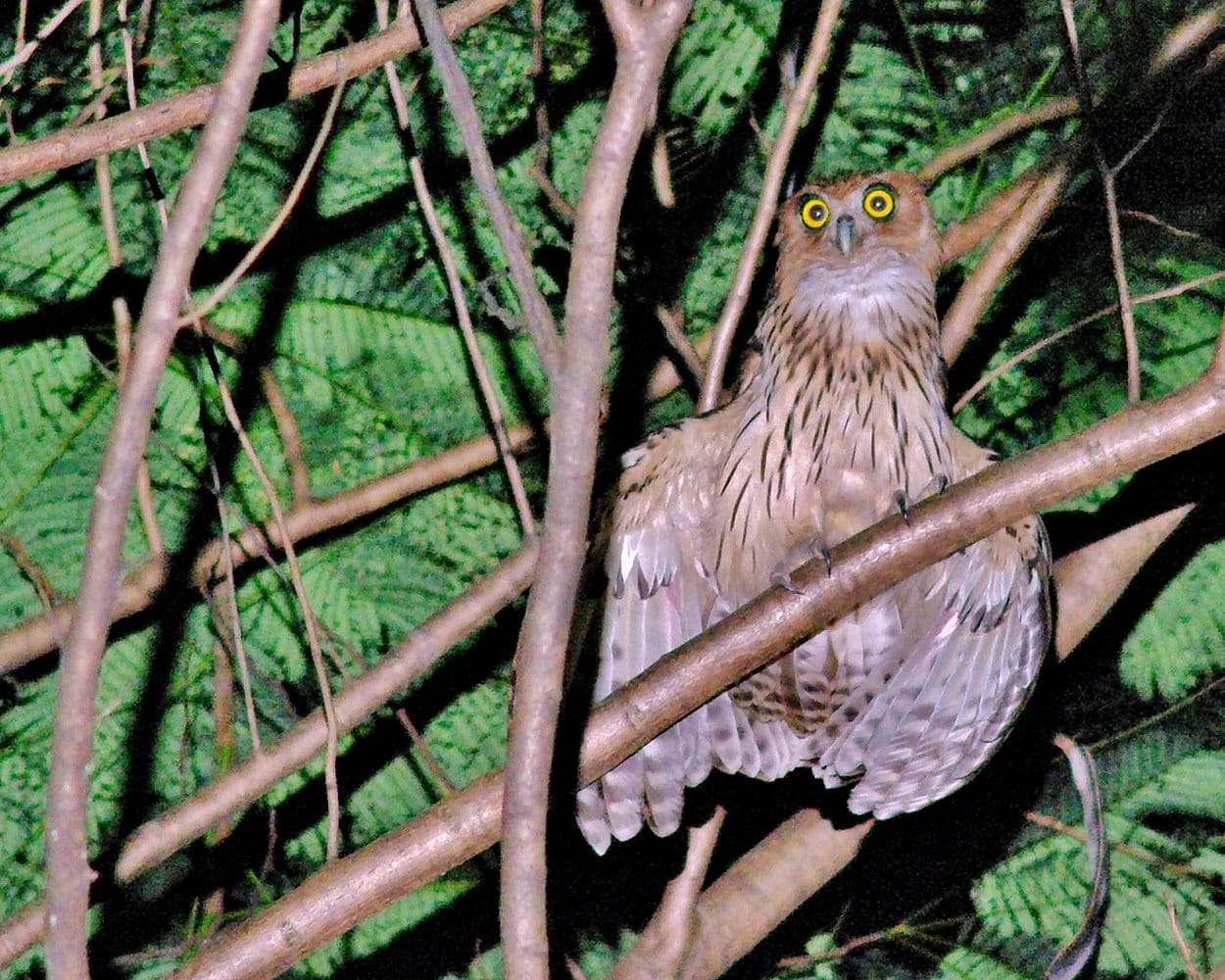 On the afternoon of December 28, 2011, a senior manager I work with told me that the maintenance staff at an office canteen pointed to him an owl perched at one of the acacia trees seen from the canteen’s veranda. Eager to see it, we hurriedly went to the veranda and… WOWL!!! For a relatively huge bird, it blended well with the surrounding branches and leaves at the canopy. Using my office mate’s tiny binoculars, I took note of its features—huge size, large yellow eyes, big sharp claws, ear tufts, greyish beak, brown face with lighter brown edge, brown wings, reddish brown upper chest becoming lighter down to the belly with dark brown streaks. I didn’t have my Kennedy guide book in the office that day so I couldn’t confirm what species it is, but I was so excited that I called up fellow WBCP member Maia Tañedo and she gave me the idea that it MIGHT be a Philippine Eagle Owl.