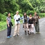As a bonus we also inhaled fresh oxygen, did some forest bathing (Shinrin-Yoku Forest Therapy), and shared stories.  We were told that if we came upon a bridge, that is as far as we should go.  About halfway there, I excitedly trained my bins on some noise and rustling atop the trees.  Ooh, maybe a Tarictic?  Gah, monkeys!  Quite a lot of them, actually.  I broke out in a cold sweat and froze in my tracks.  My companions calmed me down, reminded me of Rocky’s presence, and we forged ahead.  A bit later, Rocky got bored of us old ladies not keeping up with him so he disappeared.  When noon rolled around, we decided to make our way down where we ran into Gayatri Hasan who showed us a strange flower and a beautiful feather she found.