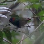 The following morning we were up on site before dawn. Bukidnon Woodcock flew over roding a few times and Mindanao Scops Owl came close but remained hidden. We were hopeful of a clear dry morning and disappointed when the fog rolled in before 6am. Thankfully the discovery of a nearby fruiting bush means our short time on site was not wasted. Red-eared Parrotfinch was the bird that led us to the bush but once there we watched as mixed flocks moved through; Olive-backed Flowerpecker, Cinnamon Ibon and Rufous-headed Tailorbird passed and then Linas Sunbird visiting a flowering vine. After an hour Flame-crowned Flowerpecker joined the action. Winter visitors were in evidence here too with Mugimaki Flycatcher and two Olive-backed Pipits.