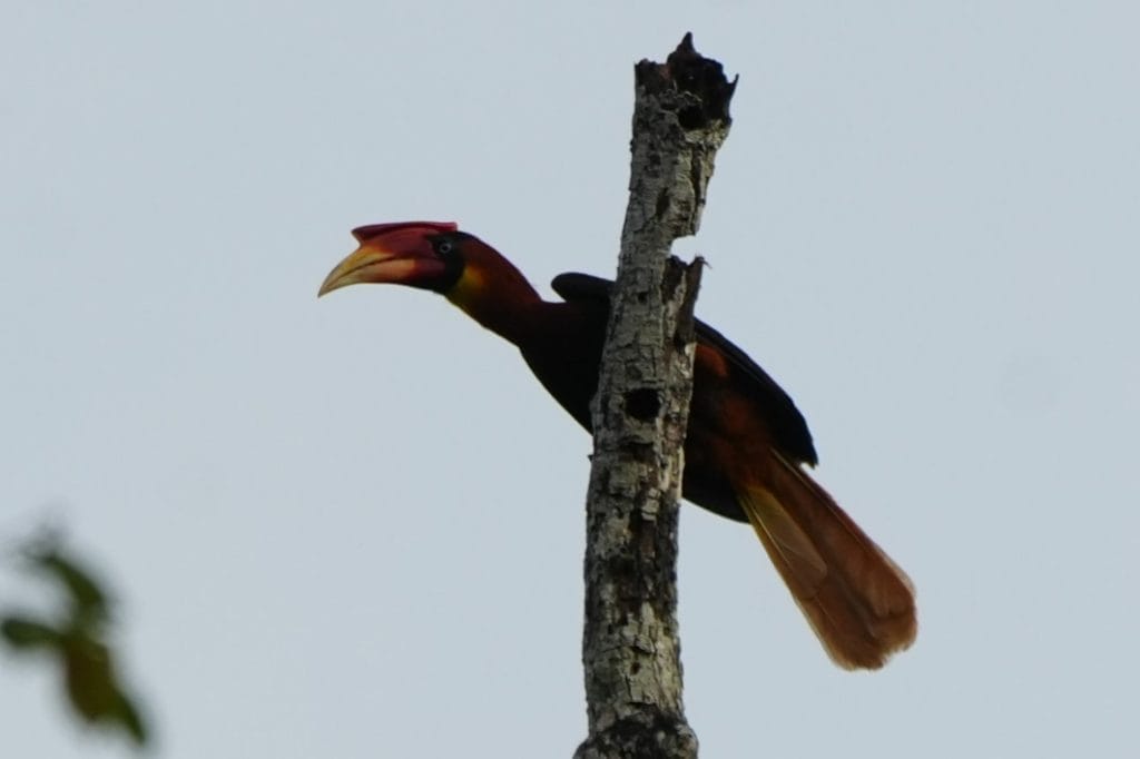 We turned right into a small trail where, a few meters in, we flushed a bird from the ground with a very distinct wing flap sound. Internally, I was thinking that might have been a Mindanao Bleeding-heart, but it might have just been wishful thinking. The trail led to a large clearing surrounded by tall trees. Immediately after our entry, a family of Southern Rufous Hornbills flew in and perched for a good while to the delight of the group.