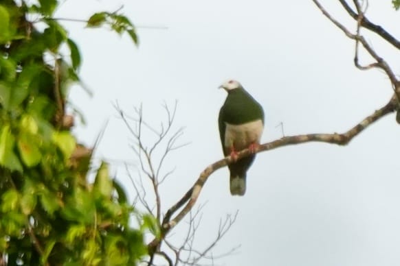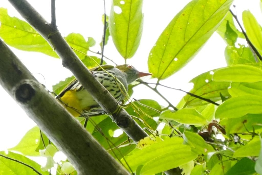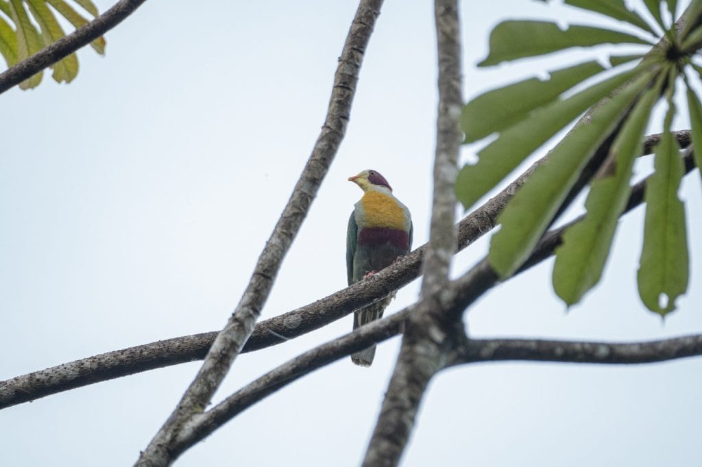 Since our trip was time-limited, we proceeded once again to the broad stream in an attempt to spot the Southern Silvery Kingfisher. While making our way along the trail, we noticed a couple of birds swooping overhead before perching above us—Yellow-Breasted Fruit Doves, another lifer! They gave us great views before flying off after feeding on a nearby fruiting tree.